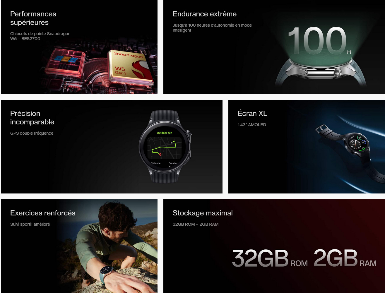 - Écran : tactile AMOLED 1,43" Résolution 466 x 466, verre saphir 2.5D